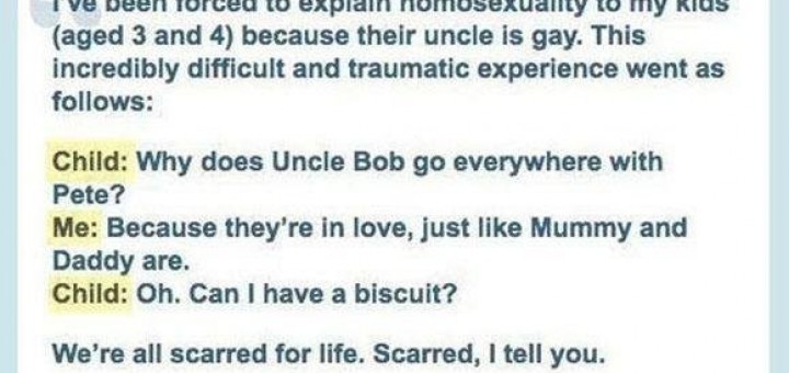 I’ve been forced to explain homo to my kids (Aged 3 and 4) because their uncle is .This incredibly difficult and traumatic experience went as follows: Child:Why does Uncle Bob go everywhere with peter?...