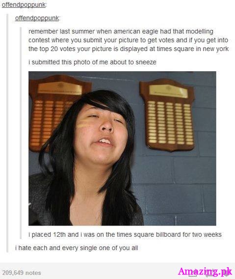 Remember last summer when american eagle had that modelling contest where you submit your picture to get votes and if you get into the top 20 votes your picture is displayed at times square in new York | I Submit this photo of me about to sneeze i placed 12th and i was on the times square billboard for two weeks i hate each and every single one of you all